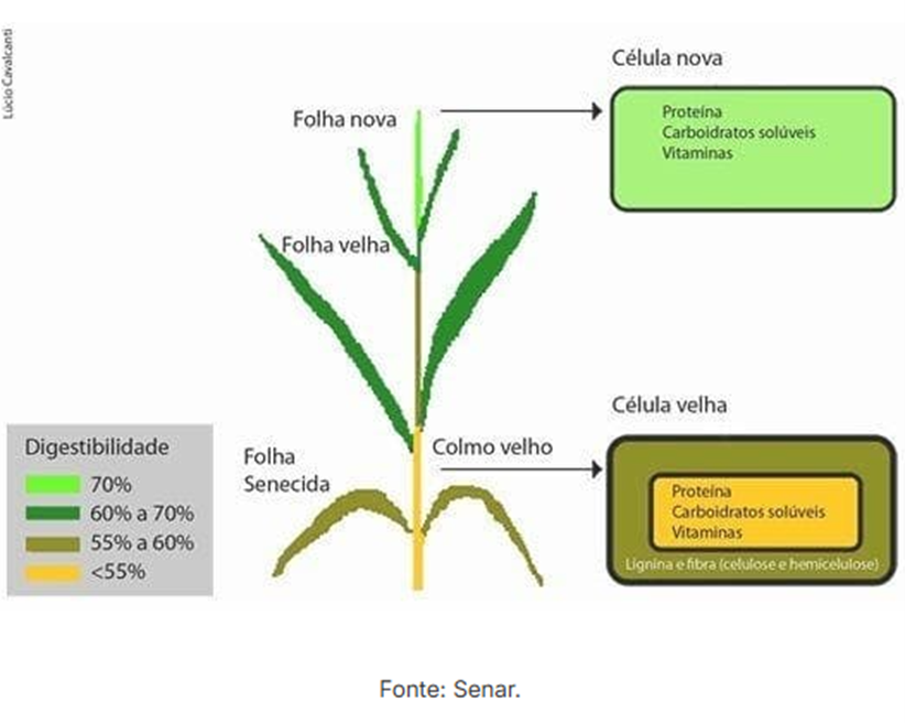 Quanto maior for a maturação do capim, ou seja, mais velho, maior será o teor de lignina e maior o impacto negativo do ponto de vista nutricional.