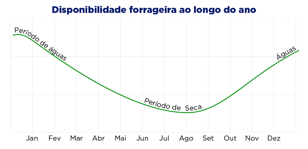 A produção de forrageiras ao longo de um ano não é uniforme, existe uma variação na produtividade do pasto devido aos fatores ambientais, como o clima. E esse é um dos maiores desafios para o produtor.