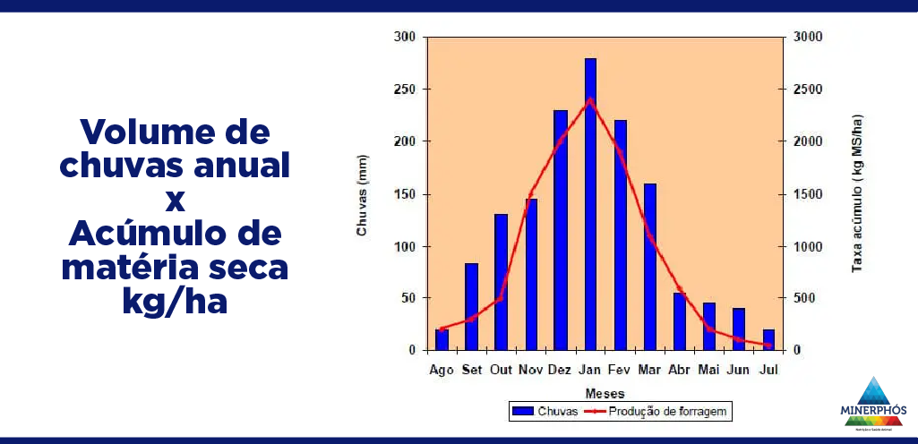 Com a redução no volume de chuvas, a queda gradual da temperatura e os dias mais curtos, com menor luminosidade, ocorre uma diminuição na taxa de crescimento das pastagens, redução do perfilhamento e menor produção de massa verde.